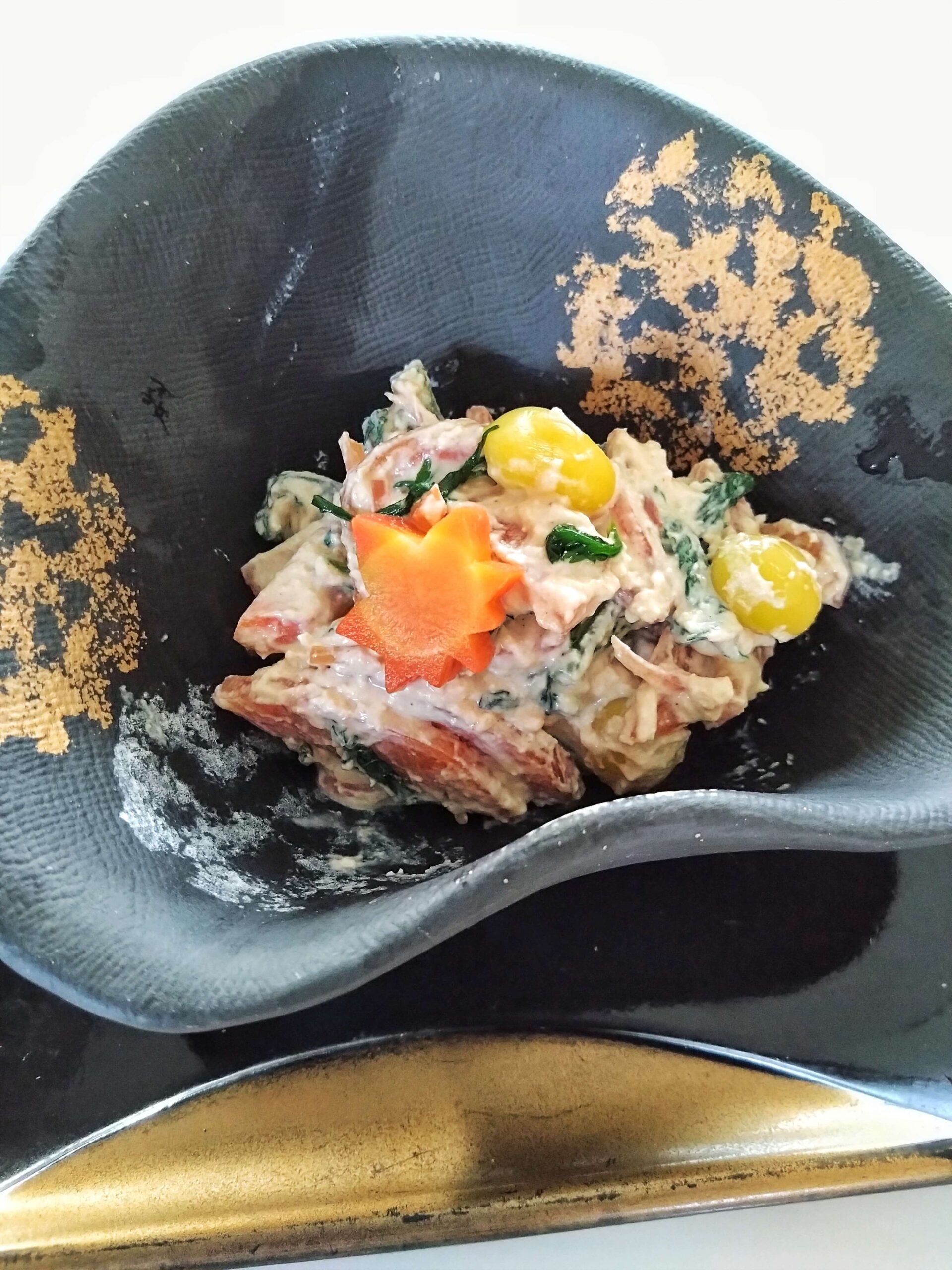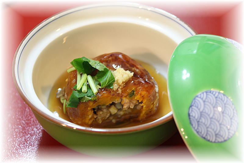 鶏そぼろを包み込んだかぼちゃのお饅頭です。