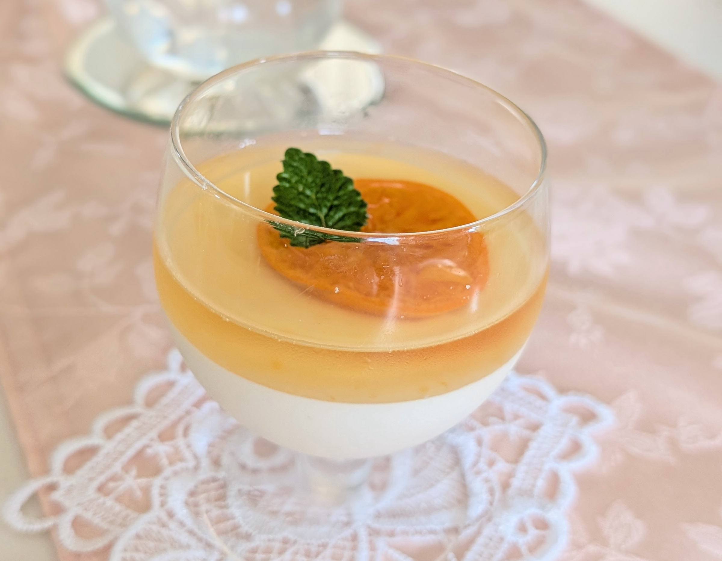 下はオレンジ風味のパンナコッタ、上はオレンジのジュレと贅沢なデザートです。