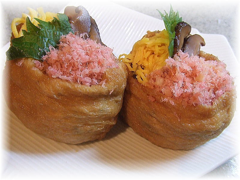 鯛のあらから作る、自家製のでんぶを使ったおいなりさん。